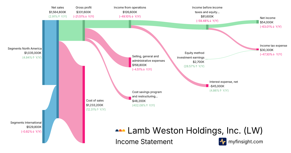 For the quarter ending 2026-02-22, LW made $1,564,800K in revenue. $54,000K in net income. Net profit margin of 3.45%.