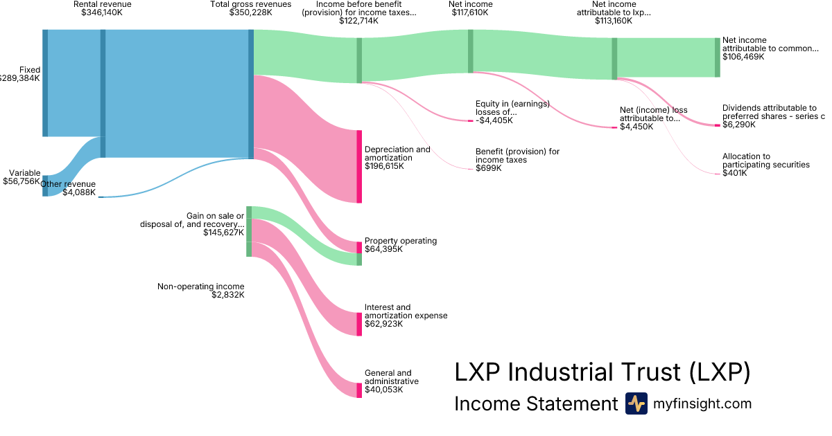 For the year ending 2025-12-31, LXP made $350,228K in revenue. $106,469K in net income. Net profit margin of 30.40%.