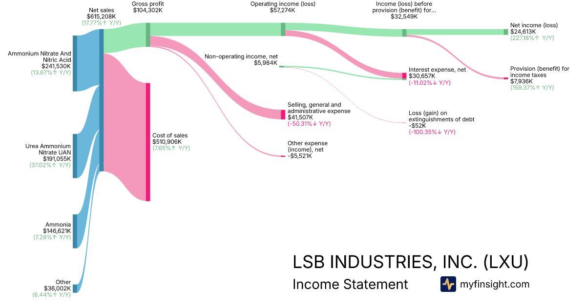 For the year ending 2025-12-31, LXU made $615,208K in revenue. $24,613K in net income. Net profit margin of 4.00%.