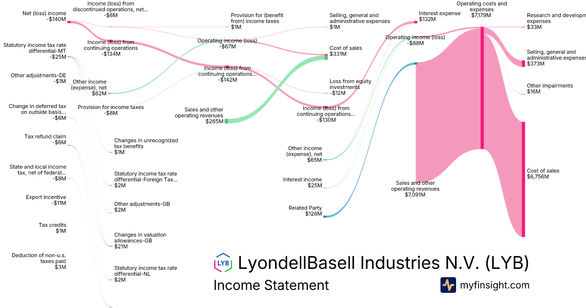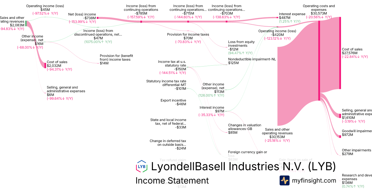 For the year ending 2025-12-31, LYB made $30,153M in revenue. -$738M in net income. Net profit margin of -2.45%.