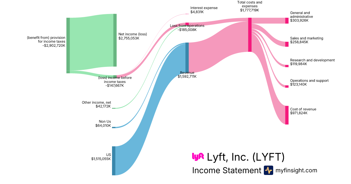 For the year ending 2025-12-31, LYFT made $6,316,261K in revenue. $2,844,008K in net income. Net profit margin of 45.03%.
