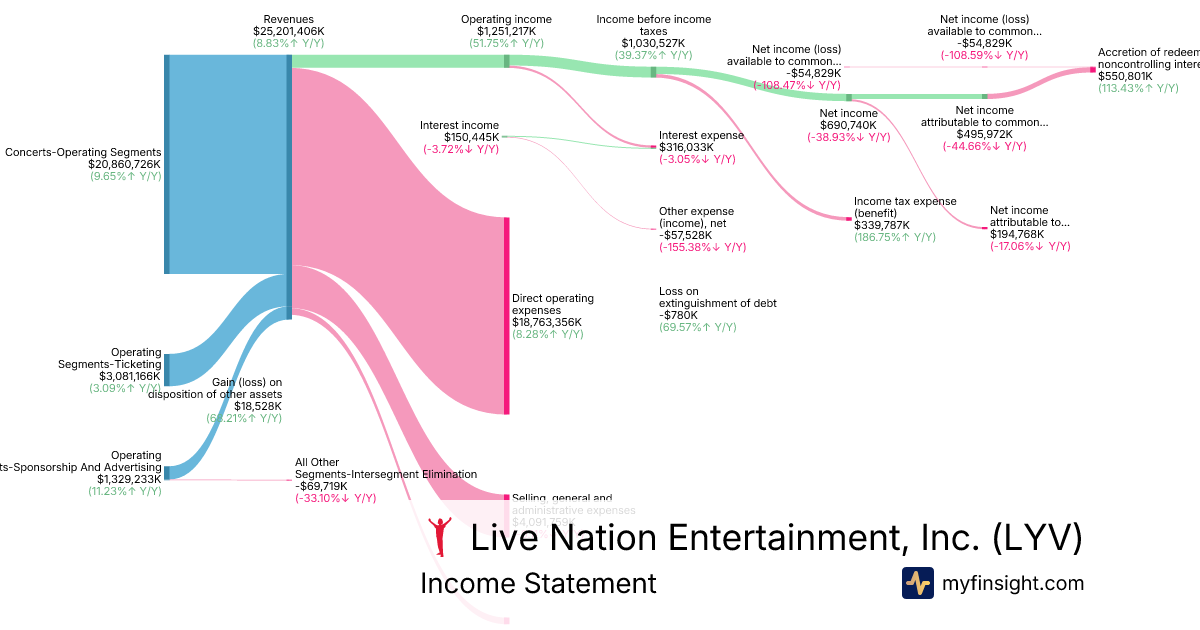 For the year ending 2025-12-31, LYV made $25,201,406K in revenue. -$54,829K in net income. Net profit margin of -0.22%.