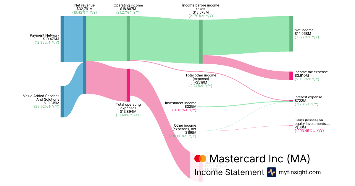 For the year ending 2025-12-31, MA made $32,791M in revenue. $14,968M in net income. Net profit margin of 45.65%.