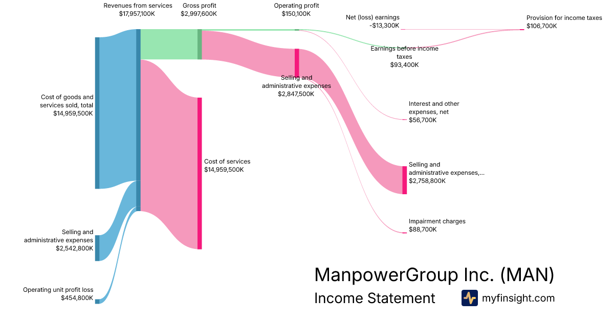 For the year ending 2025-12-31, MAN made $17,957,100K in revenue. -$13,300K in net income. Net profit margin of -0.07%.