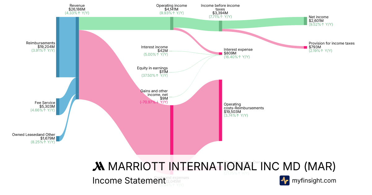 For the year ending 2025-12-31, MAR made $26,186M in revenue. $2,601M in net income. Net profit margin of 9.93%.