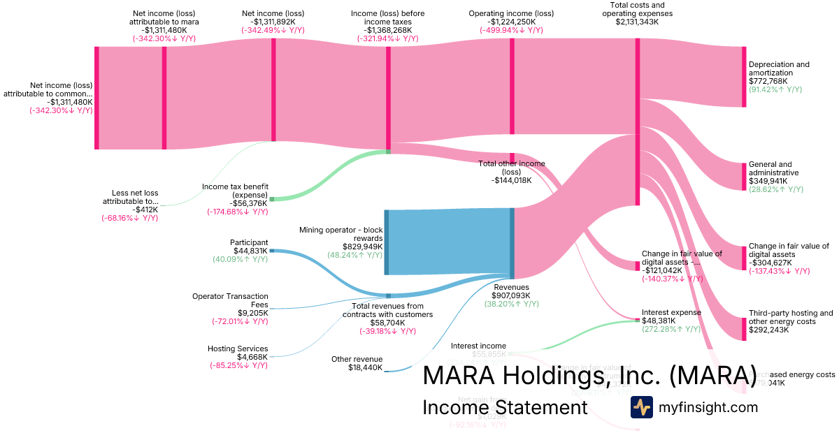 For the year ending 2025-12-31, MARA made $907,093K in revenue. -$1,311,480K in net income. Net profit margin of -144.58%.