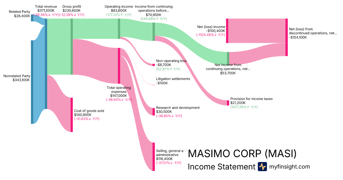For the quarter ending 2025-09-27, MASI made $371,500,000 in revenue. -$100,400,000 in net income. Net profit margin of -27.03%.