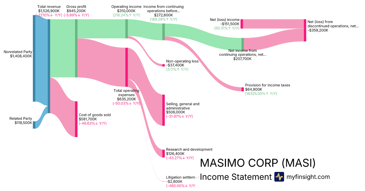 For the year ending 2026-01-03, MASI made $1,526,900K in revenue. -$151,500K in net income. Net profit margin of -9.92%.