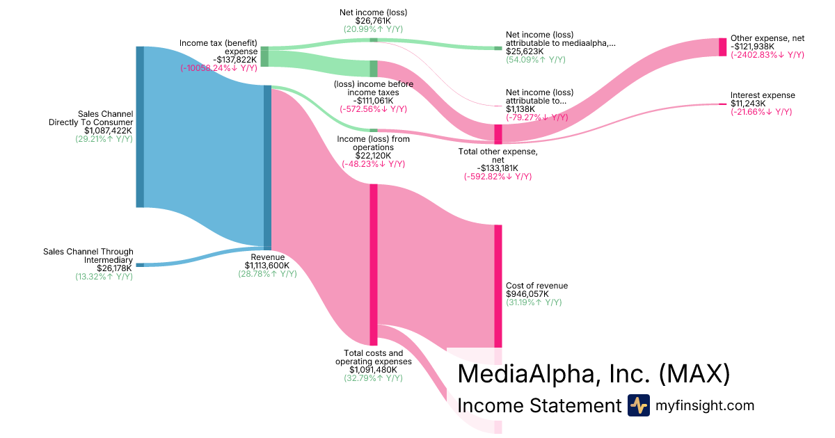 For the year ending 2025-12-31, MAX made $1,113,600K in revenue. $25,623K in net income. Net profit margin of 2.30%.