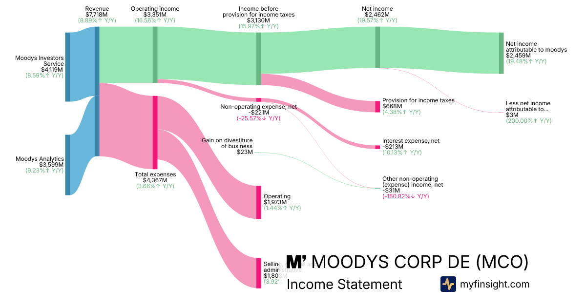 For the year ending 2025-12-31, MCO made $7,718M in revenue. $2,459M in net income. Net profit margin of 31.86%.