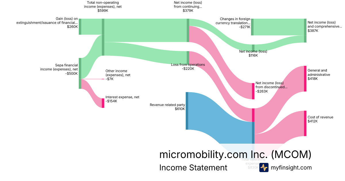 For the quarter ending 2025-09-30, MCOM made $929K in revenue. $387K in net income. Net profit margin of 41.66%.