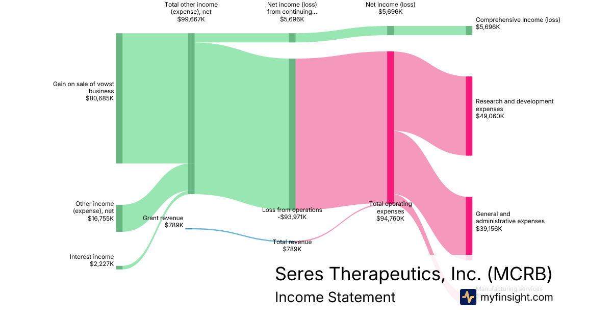 For the year ending 2025-12-31, MCRB made $789K in revenue. $5,696K in net income. Net profit margin of 721.93%.