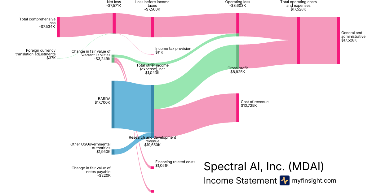 For the year ending 2025-12-31, MDAI made $19,650K in revenue. -$7,534K in net income. Net profit margin of -38.34%.
