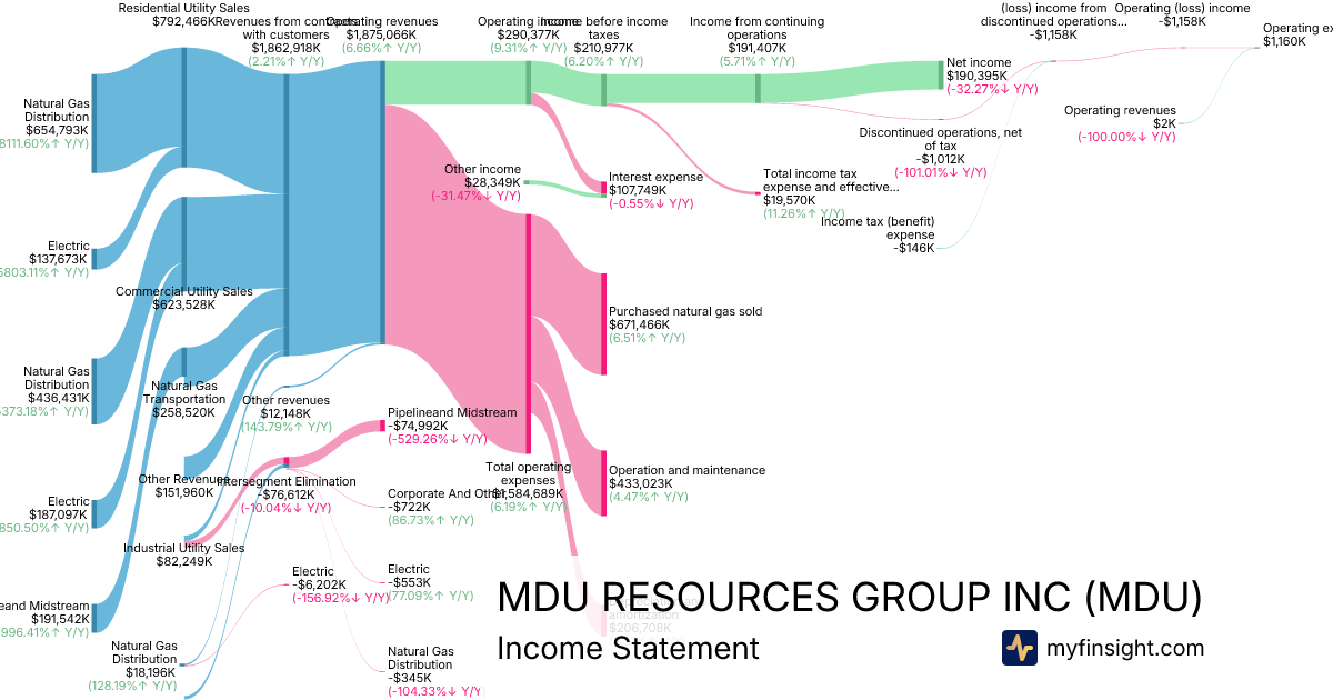For the year ending 2025-12-31, MDU made $1,875,066K in revenue. $190,395K in net income. Net profit margin of 10.15%.