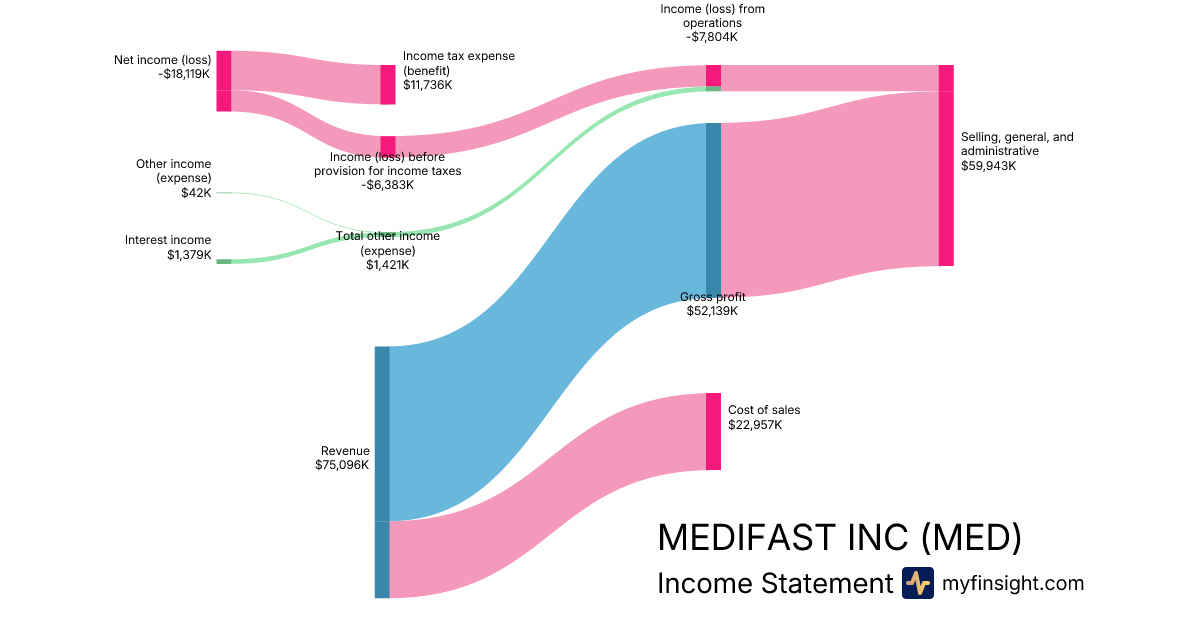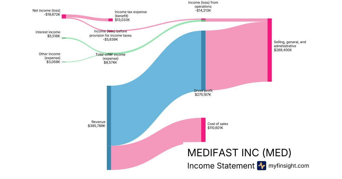 For the year ending 2025-12-31, MED made $385,788K in revenue. -$18,672K in net income. Net profit margin of -4.84%.