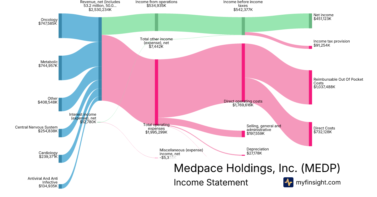 For the year ending 2025-12-31, MEDP made $2,530,234K in revenue. $451,123K in net income. Net profit margin of 17.83%.