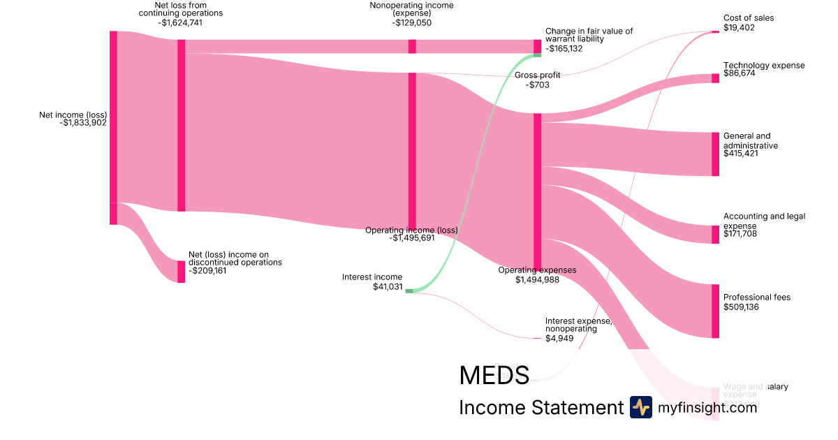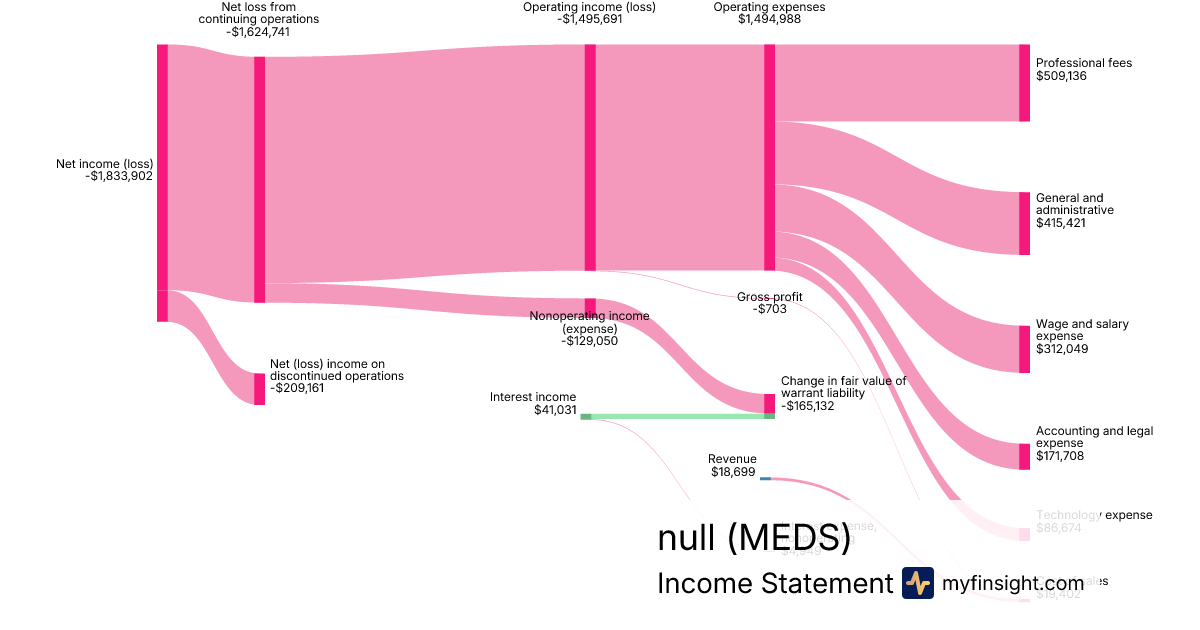 For the quarter ending 2024-06-30, MEDS made $18,699 in revenue. -$1,833,902 in net income. Net profit margin of -9807.49%.