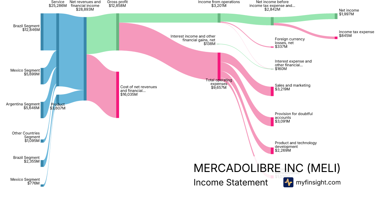 For the year ending 2025-12-31, MELI made $28,893M in revenue. $1,997M in net income. Net profit margin of 6.91%.
