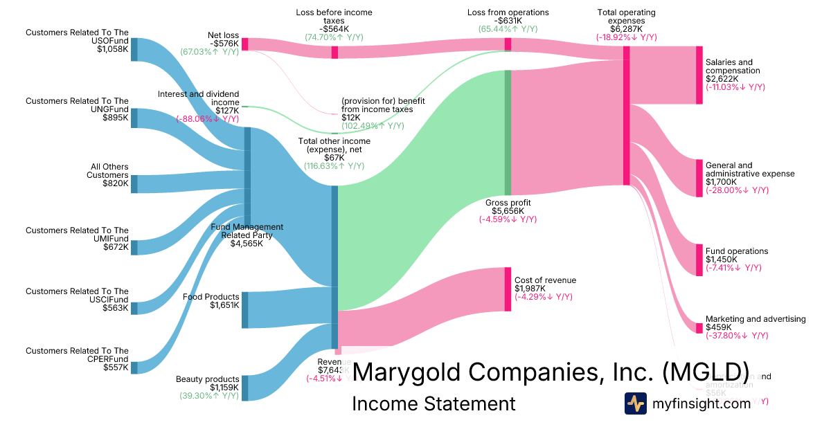 For the quarter ending 2025-12-31, MGLD made $7,643K in revenue. -$576K in net income. Net profit margin of -7.54%.