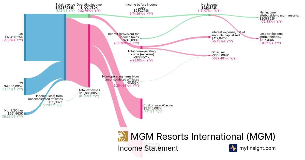 For the year ending 2025-12-31, MGM made $17,537,683K in revenue. $205,862K in net income. Net profit margin of 1.17%.