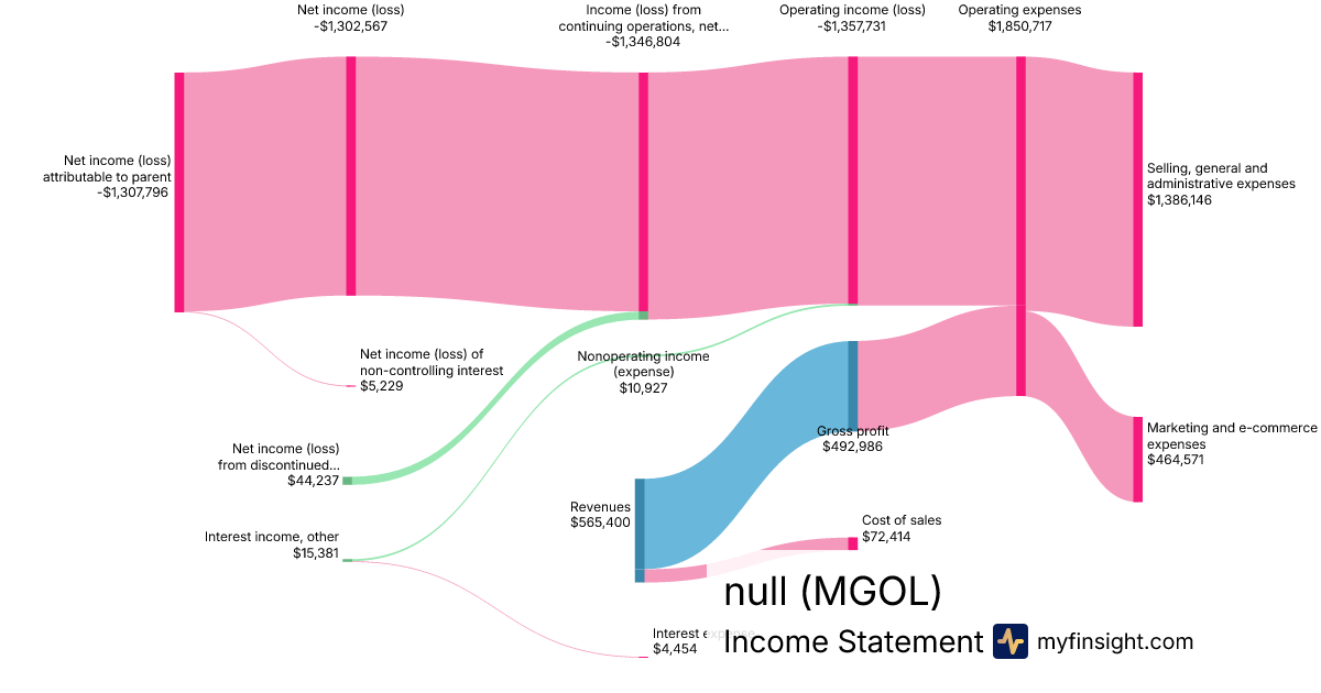 For the quarter ending 2024-09-30, MGOL made $565,400 in revenue. -$1,307,796 in net income. Net profit margin of -231.30%.