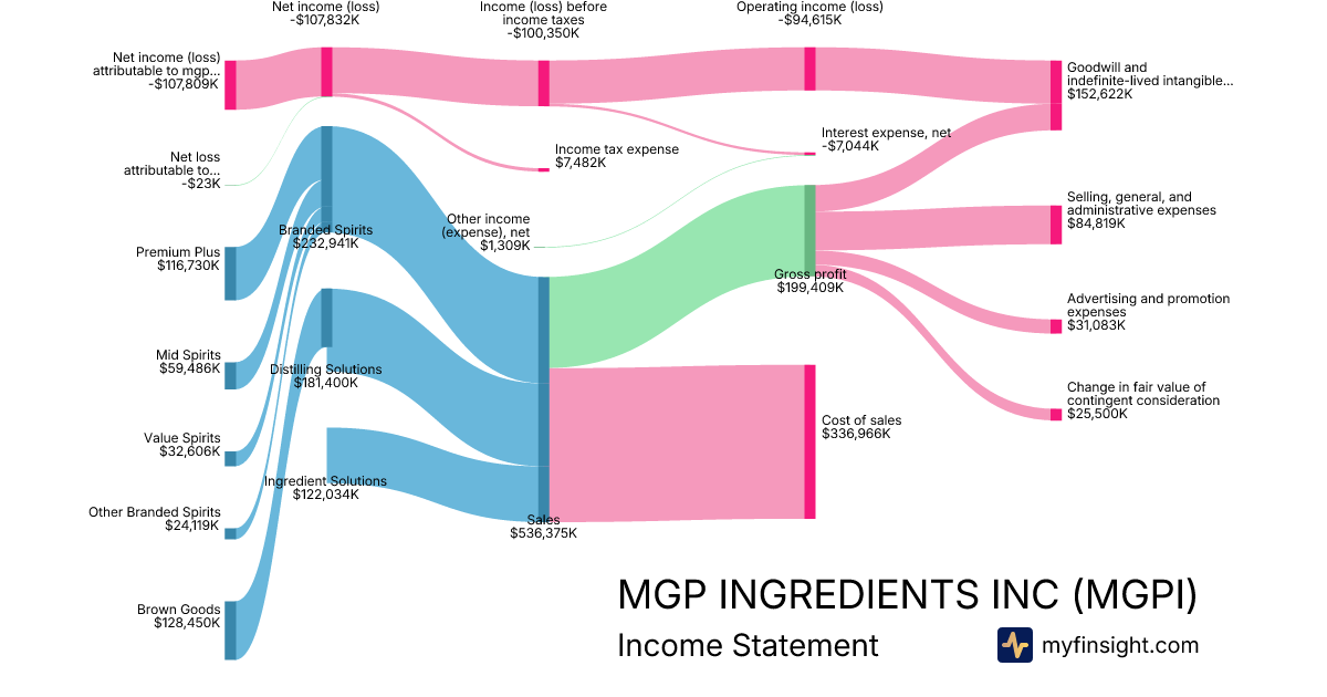 For the year ending 2025-12-31, MGPI made $536,375K in revenue. -$107,809K in net income. Net profit margin of -20.10%.