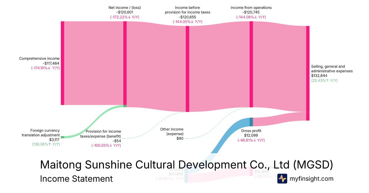For the quarter ending 2025-12-31, MGSD made $24,905 in revenue. -$117,484 in net income. Net profit margin of -471.73%.