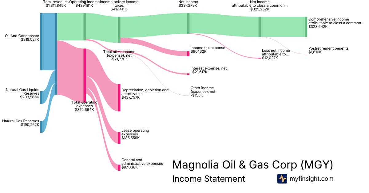For the year ending 2025-12-31, MGY made $1,311,845K in revenue. $323,642K in net income. Net profit margin of 24.67%.