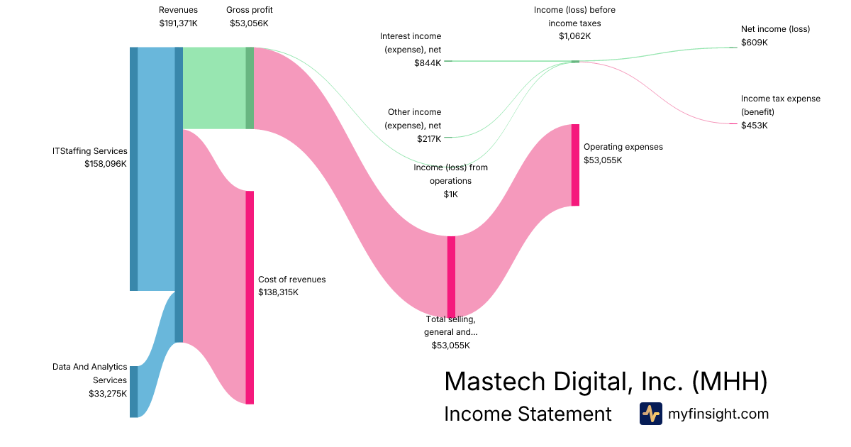 For the year ending 2025-12-31, MHH made $191,371K in revenue. $609K in net income. Net profit margin of 0.32%.