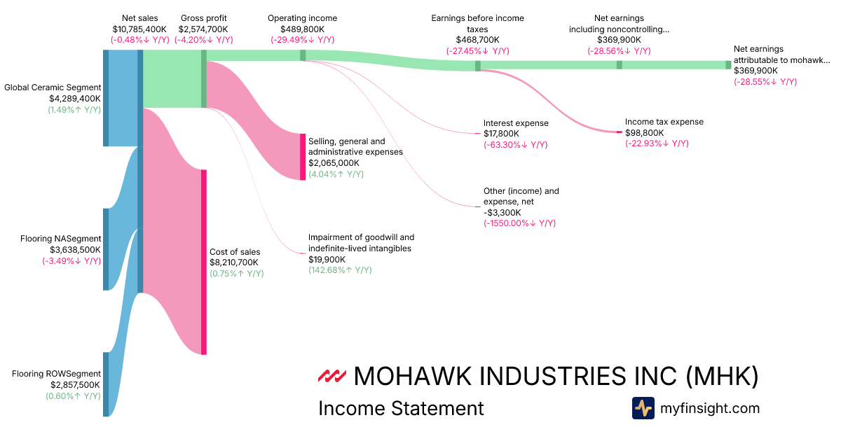 For the year ending 2025-12-31, MHK made $10,785,400K in revenue. $369,900K in net income. Net profit margin of 3.43%.
