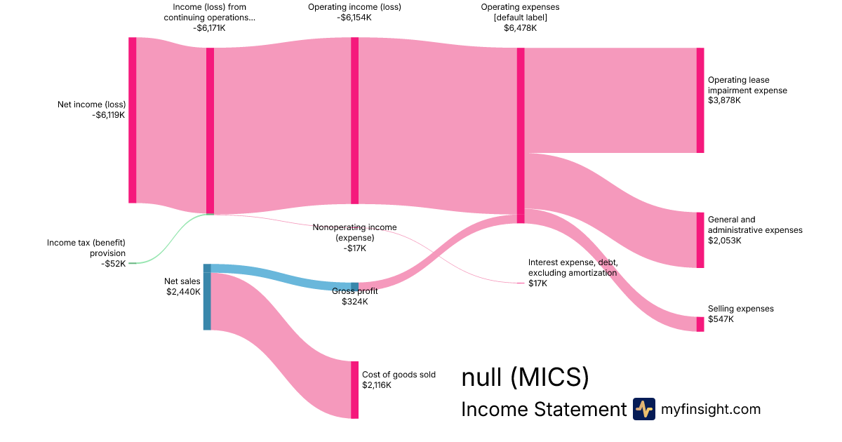 For the quarter ending 2024-06-30, MICS made $2,440K in revenue. -$6,119K in net income. Net profit margin of -250.78%.