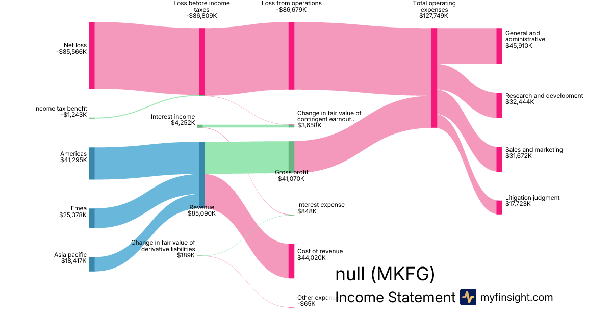 For the year ending 2024-12-31, MKFG made $85,090K in revenue. -$85,566K in net income. Net profit margin of -100.56%.