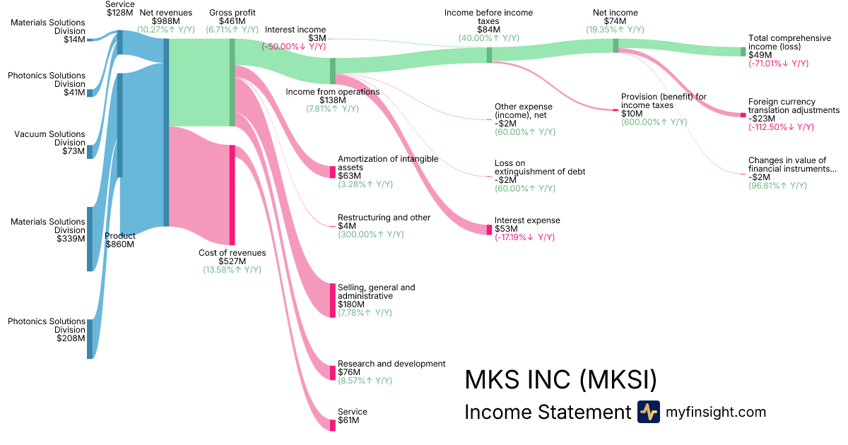 For the quarter ending 2025-09-30, MKSI made $988,000K in revenue. $49,000K in net income. Net profit margin of 4.96%.