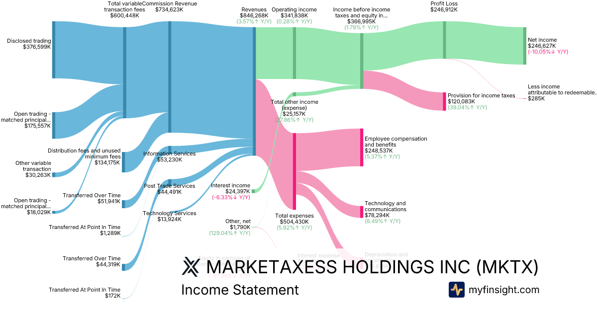 For the year ending 2025-12-31, MKTX made $846,268K in revenue. $246,627K in net income. Net profit margin of 29.14%.