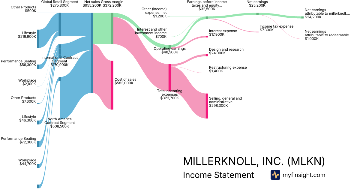 For the quarter ending 2025-11-29, MLKN made $955,200K in revenue. $24,200K in net income. Net profit margin of 2.53%.