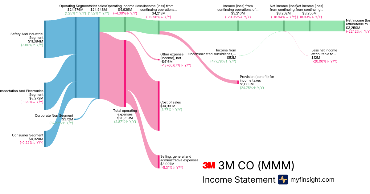 For the year ending 2025-12-31, MMM made $24,948M in revenue. $3,250M in net income. Net profit margin of 13.03%.