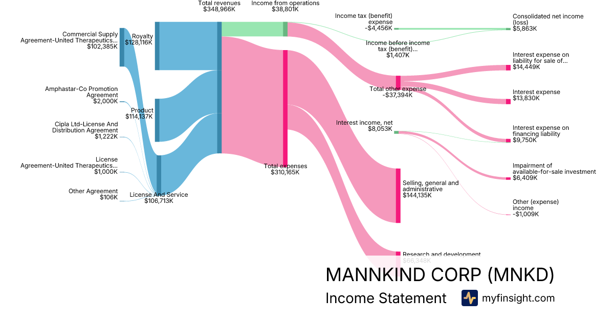 For the year ending 2025-12-31, MNKD made $348,966K in revenue. $5,863K in net income. Net profit margin of 1.68%.