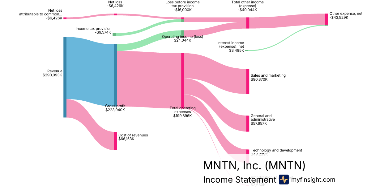 For the year ending 2025-12-31, MNTN made $290,093K in revenue. -$6,426K in net income. Net profit margin of -2.22%.
