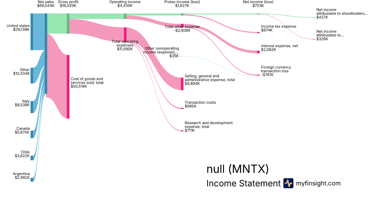 For the quarter ending 2024-09-30, MNTX made $66,544K in revenue. $427K in net income. Net profit margin of 0.64%.