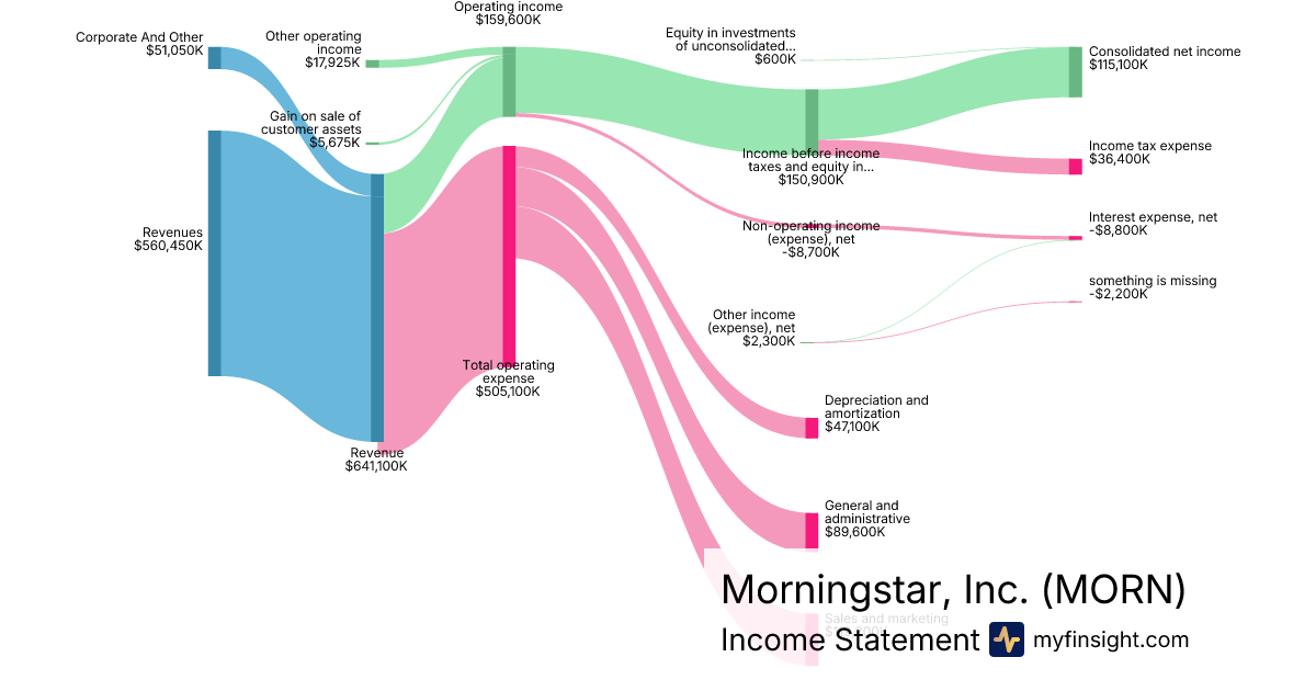 For the year ending 2025-12-31, MORN made $2,445,500K in revenue. $374,200K in net income. Net profit margin of 15.30%.