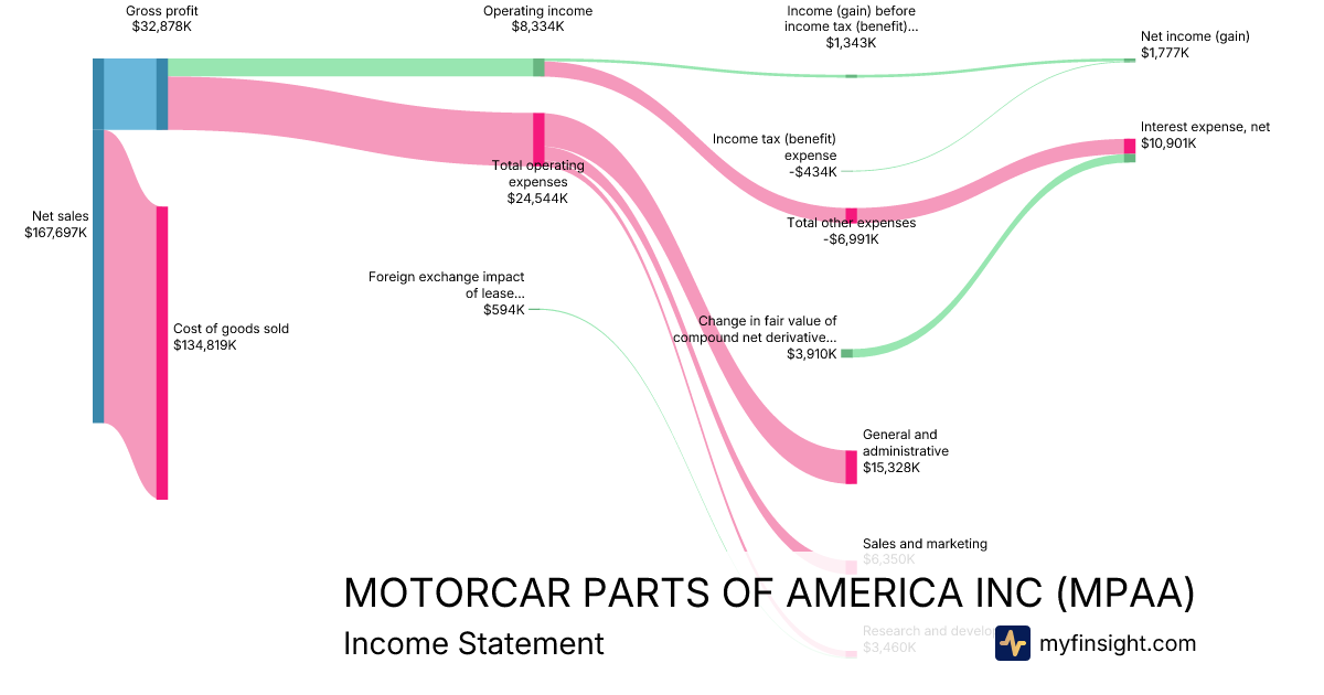 For the quarter ending 2025-12-31, MPAA made $167,697K in revenue. $1,777K in net income. Net profit margin of 1.06%.