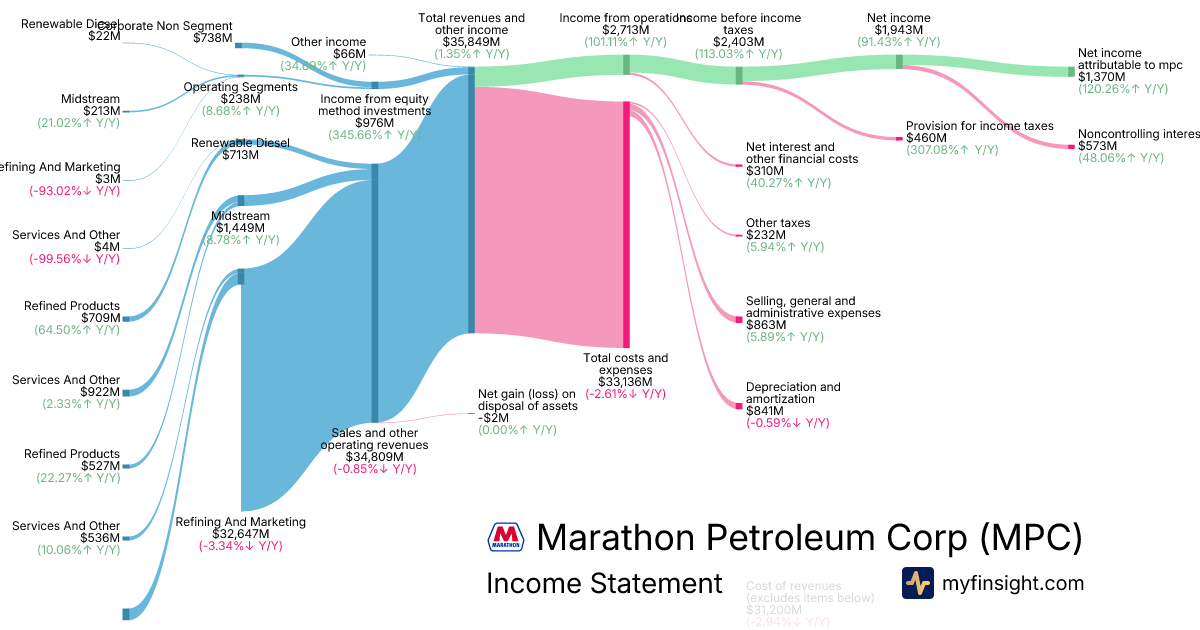 For the quarter ending 2025-09-30, MPC made $35,849M in revenue. $1,370M in net income. Net profit margin of 3.82%.