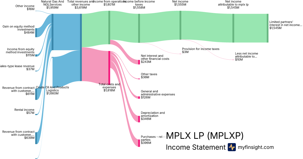 For the quarter ending 2025-09-30, MPLXP made $3,619M in revenue. $1,545M in net income. Net profit margin of 42.69%.