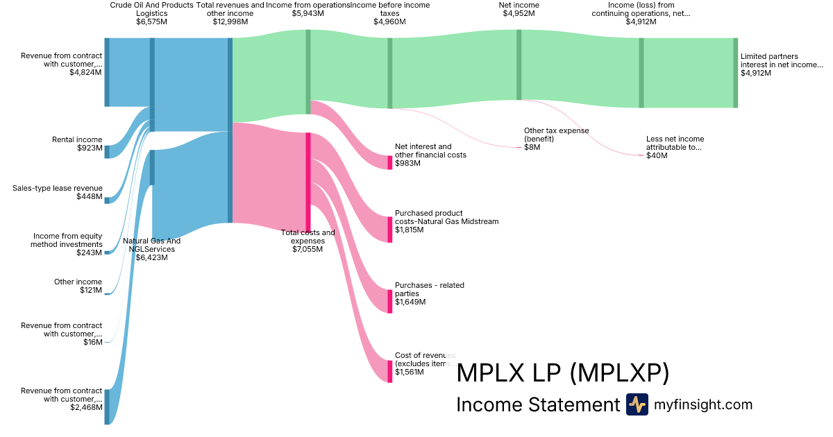 For the year ending 2025-12-31, MPLXP made $12,998M in revenue. $4,912M in net income. Net profit margin of 37.79%.