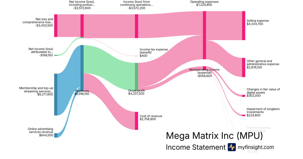 For the quarter ending 2024-06-30, MPU made $6,916,100 in revenue. -$3,403,500 in net income. Net profit margin of -49.21%.