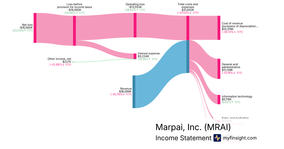 For the year ending 2025-12-31, MRAI made $18,099K in revenue. -$16,560K in net income. Net profit margin of -91.50%.