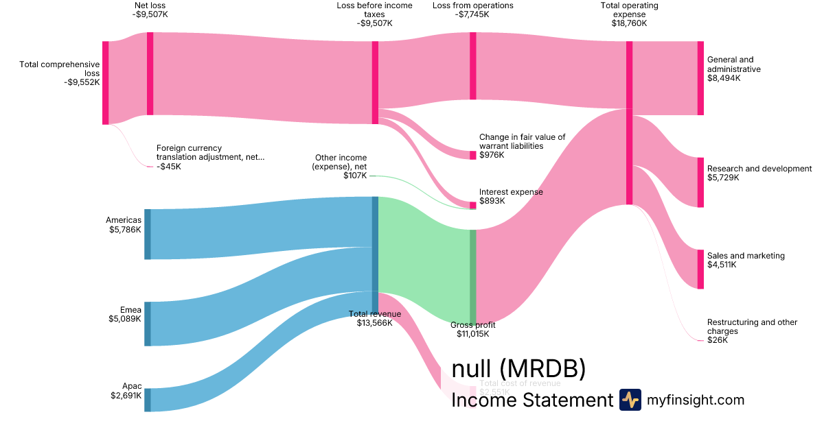 For the quarter ending 2024-06-30, MRDB made $13,566K in revenue. -$9,552K in net income. Net profit margin of -70.41%.