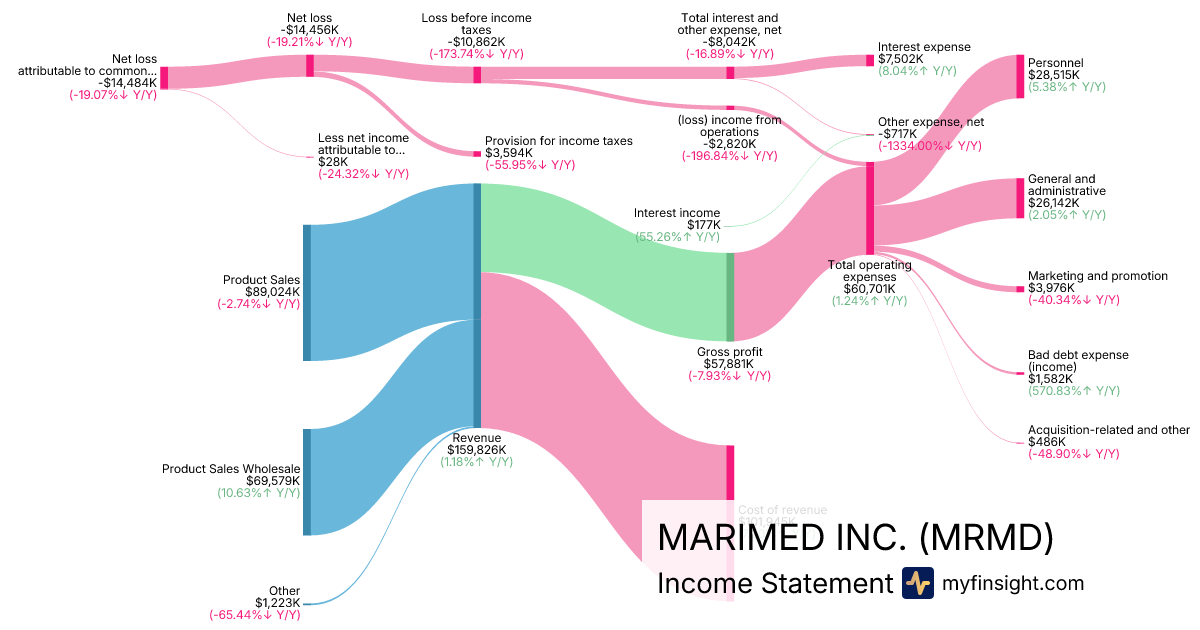 For the year ending 2025-12-31, MRMD made $159,826K in revenue. -$14,484K in net income. Net profit margin of -9.06%.