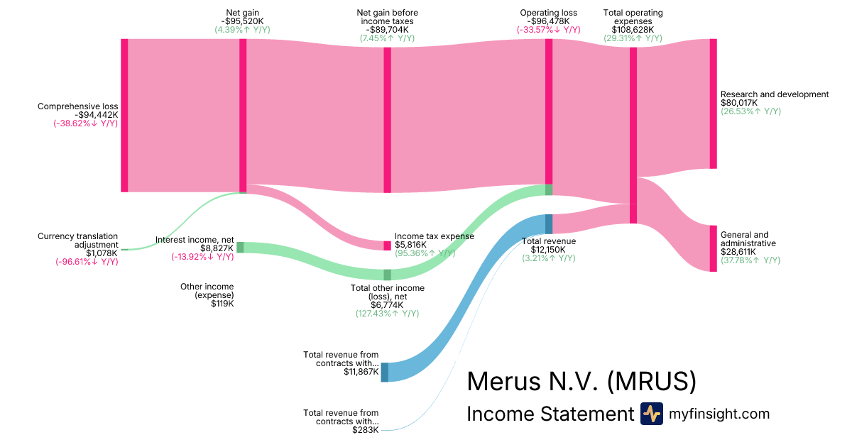 For the quarter ending 2025-09-30, MRUS made $12,150K in revenue. -$94,442K in net income. Net profit margin of -777.30%.