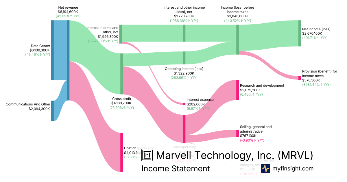 For the year ending 2026-01-31, MRVL made $8,194,600K in revenue. $2,670,100K in net income. Net profit margin of 32.58%.
